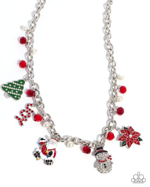 Cascading in a whimsical manner along a glistening silver cable chain, a collection of Christmas-inspired details including white pearls, faceted red beads, transparent deeper red faceted beads, a red and green-painted poinsettia flower with a pearl center, a black, red, and white rhinestone-embellished silver snowman complete with a red and black-painted top hat, a multicolored and pearl-dotted Santa, a green-painted pearl and rhinestone-dotted tree, and the silver word "JOY" with red rhinestone detailing collect below the neckline for a festive flourish. Features an adjustable clasp closure.