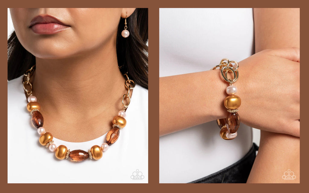 Connected to glistening gold chains, a collection of glossy soft pink pearls, Buckthorn Brown abstract pearls, studded gold discs, and faceted clear light brown oval beads Includes one pair of matching earrings. The bracelet is a direct match to the necklace. (Fashion Fix Exclusive December 2024)