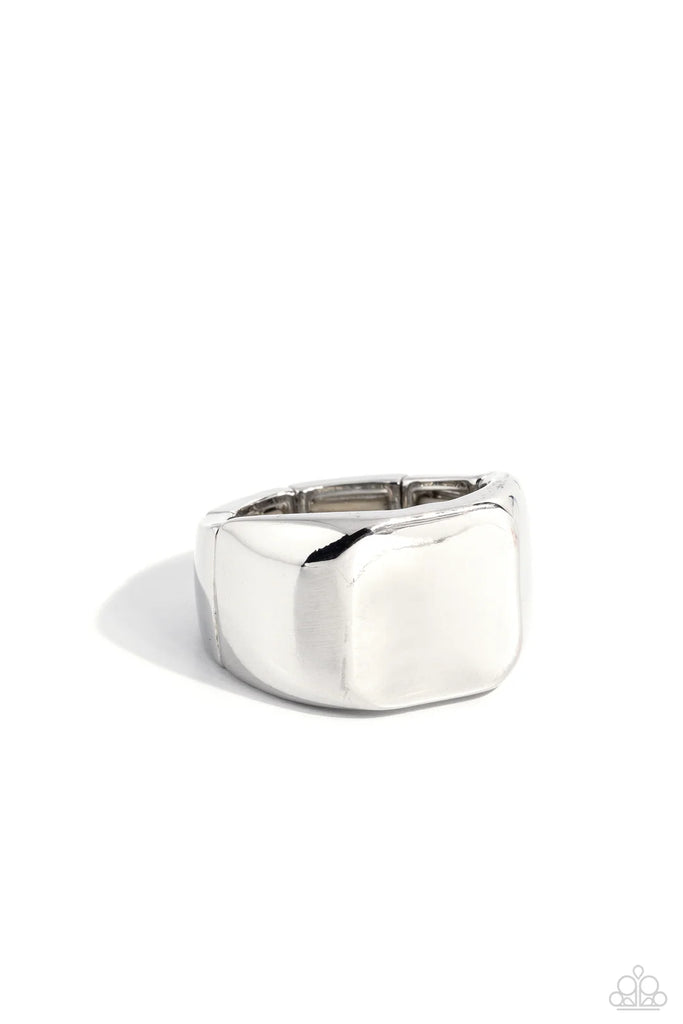 The center of a thick silver band has been smashed into a flat cube center for a casual look. Features a stretchy band for a flexible fit. (HR)