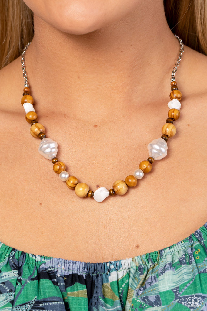 Varying mismatched tan wooden beads and studs alternate with oversized baroque pearly beads and pearly shells along an invisible wire below the collar, creating a bold beach-inspired fashion. Features an adjustable clasp closure. The bracelet is a direct match.