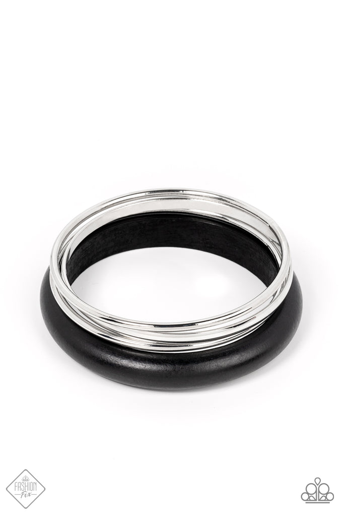 A set of three basic silver bangles stack together with a chunky black wooden bangle for a layered look. (Fashion Fix Feb 2022)