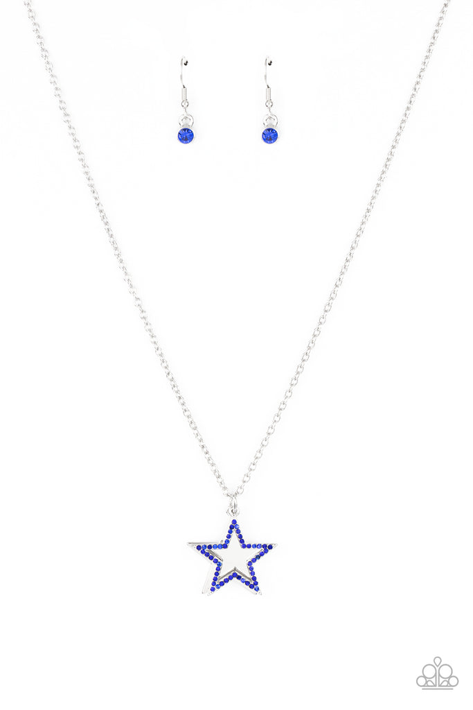 A blue rhinestone encrusted silver star delicately overlaps with a shiny silver star below the collar, creating a sparkly patriotic pendant. Features an adjustable clasp closure.
