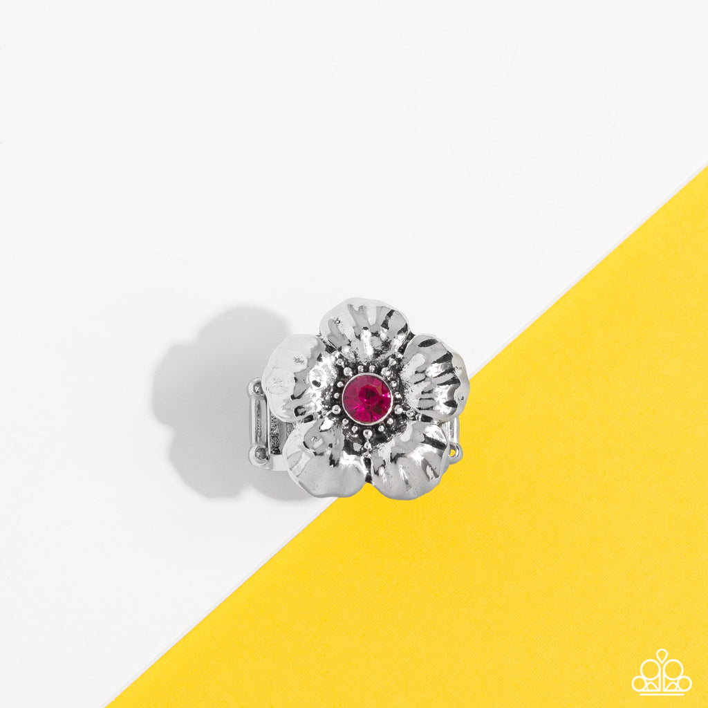 Dotted with dainty silver studs and a dainty fuchsia rhinestone center, folds of shiny silver curl into an oversized tropical flower for a whimsical dash of island inspiration atop the finger. Features a stretchy band for a flexible fit. (Fashion Fix Exclusive March 2023)