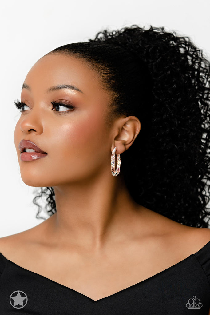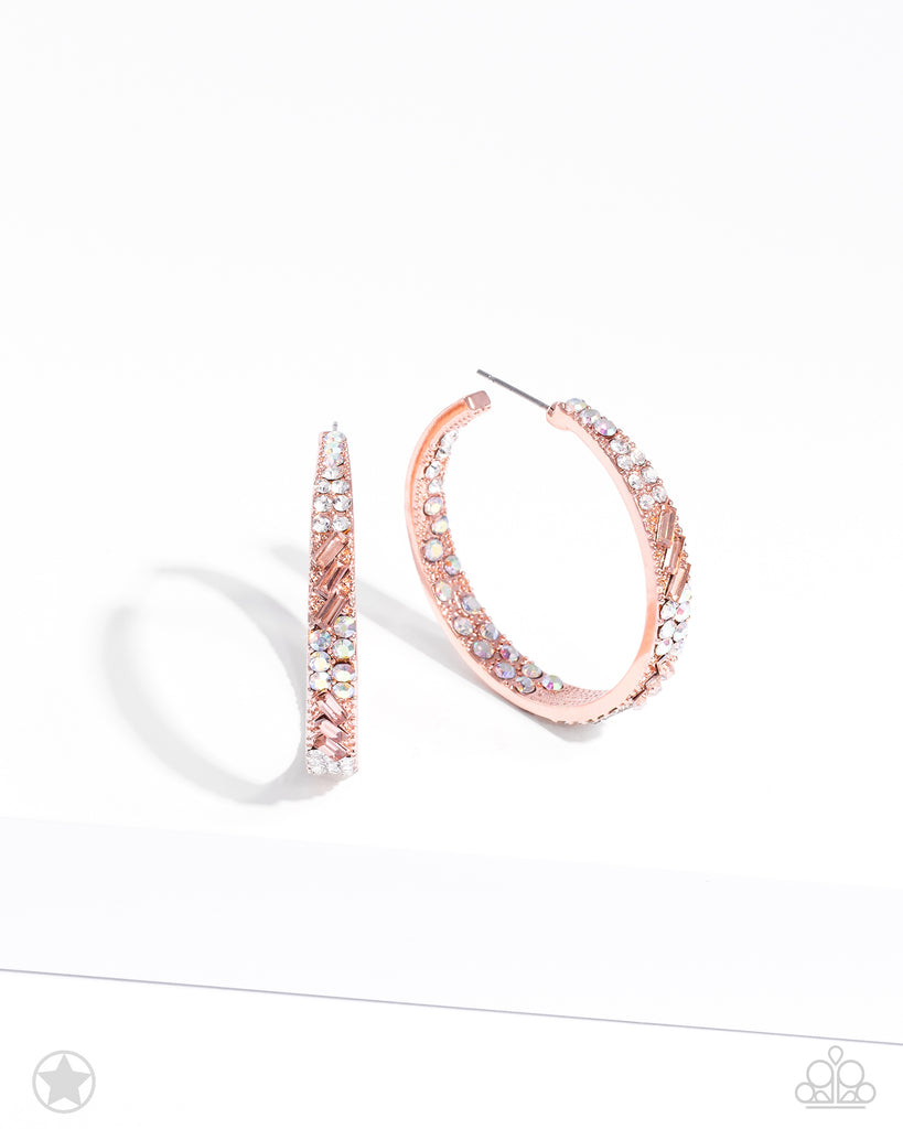 The front facing surface of a chunky shiny copper hoop is dipped in brilliantly sparkling iridescent, peach, and white rhinestones while light-catching texture wraps around the back. The interior of the hoop features the opposite pattern, creating the illusion of a full hoop of blinding rhinestones. Earring attaches to a standard post fitting. Hoop measures 1 3/4" in diameter. Due to its prismatic palette, color may vary.