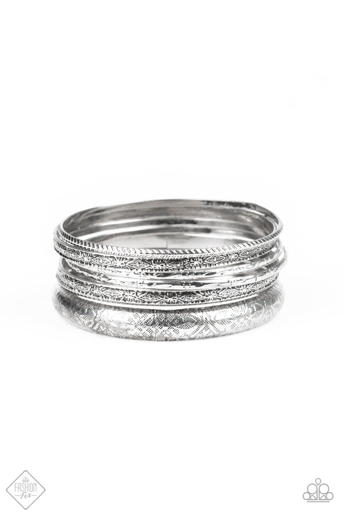 Featuring an array of floral and tribal inspired patterns, a collection of mismatched silver bangles slide along the wrist for a seasonal look. (Sunset Sightings June 2019)
