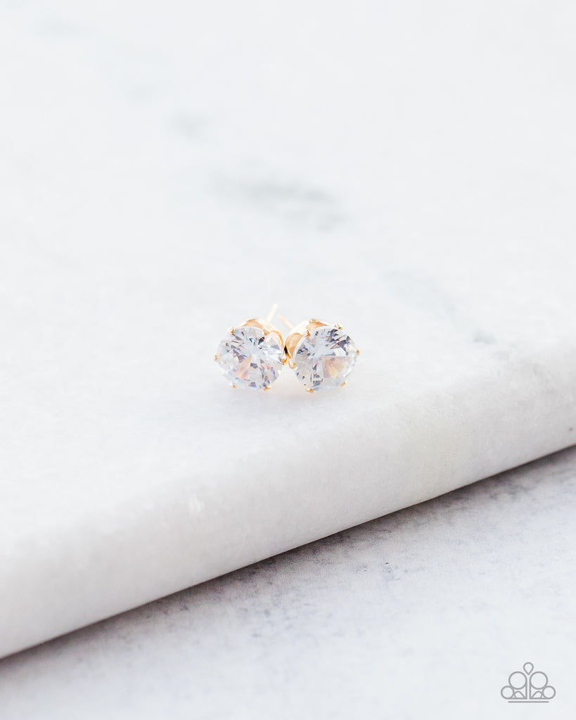 A sparkling white rhinestone is nestled inside a classic gold frame for a timeless look. Earring attaches to a standard post fitting.