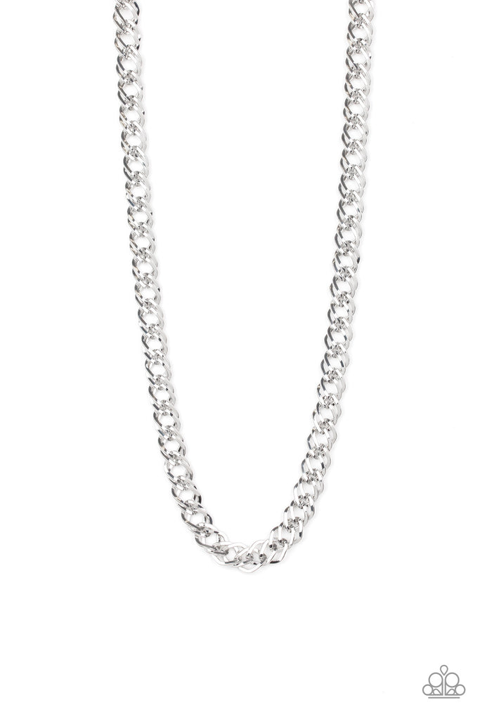 Featuring doubled links, a glistening silver chain drapes across the chest for a bold look. Features an adjustable clasp closure.